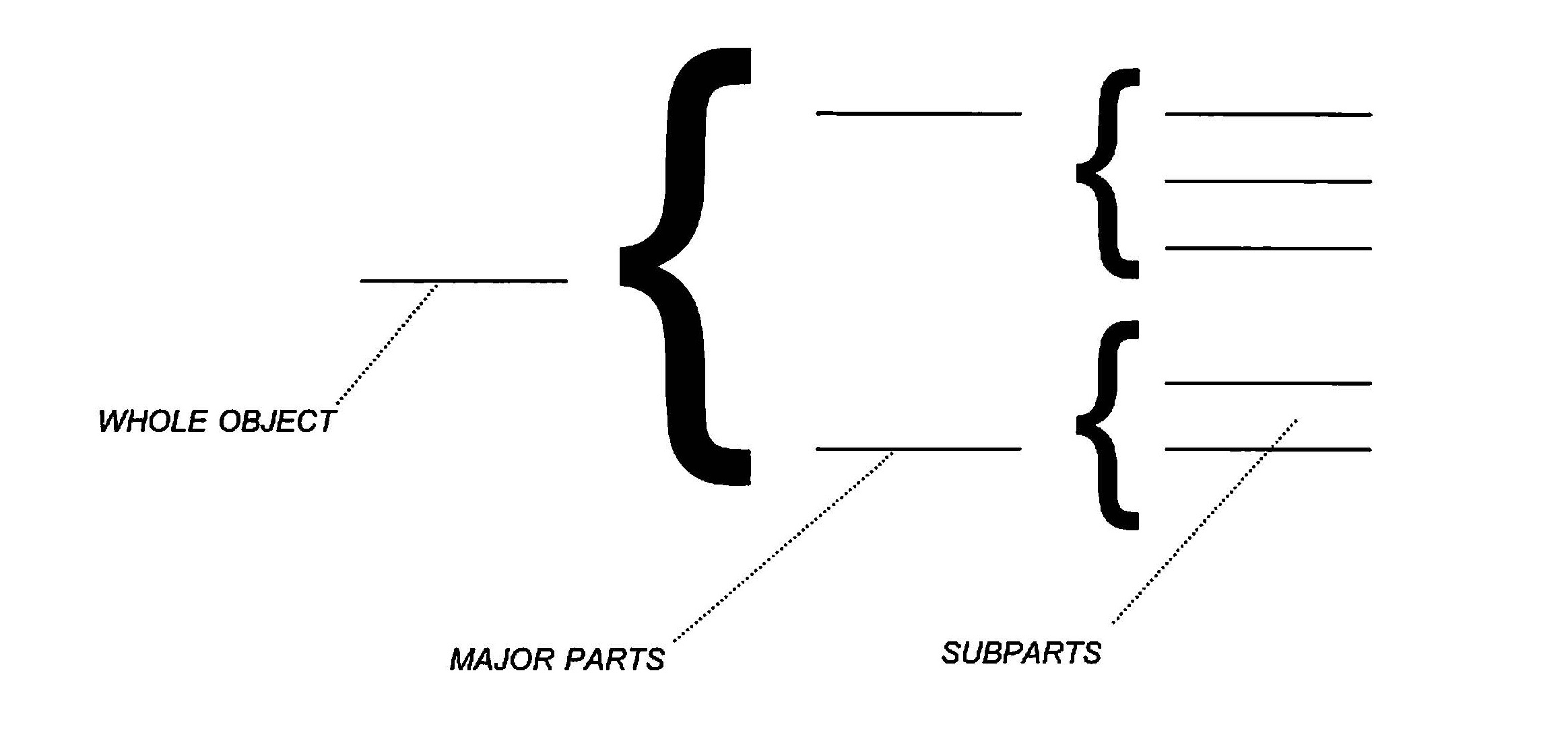 The Brace Map is used to analyze physical objects. On the line to the left, write the name of the whole object. On the lines within the first brace to the right, write the major parts of the object, then follow within the next set of braces with the subparts of each major part.