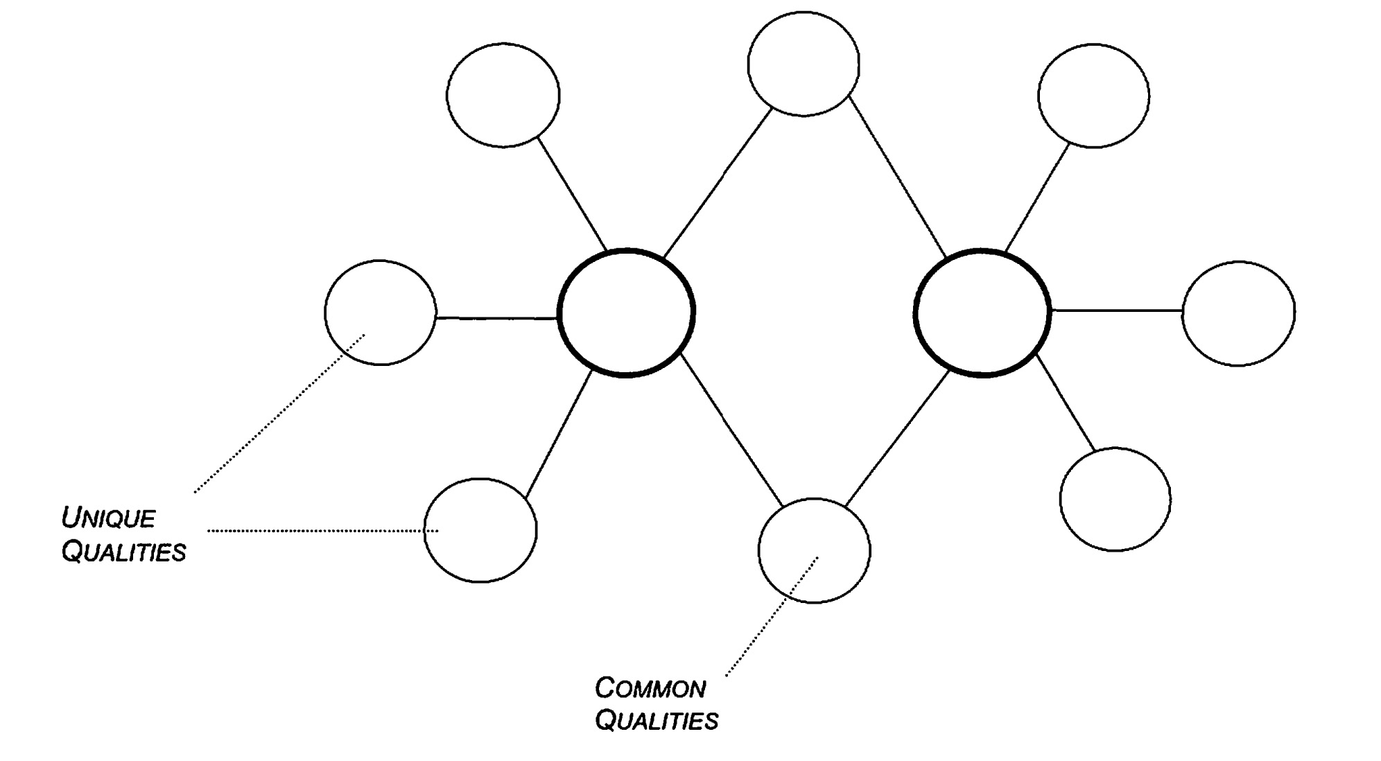 The Double Bubble Map is a tool for comparing and contrasting things. In the large circles, write the words for the two things being investigated. In the middle “bubbles,” use words and phrases that show similarity between the two things. In the outside bubbles, as connected respectively to the two things, write the words that identify their different qualities.