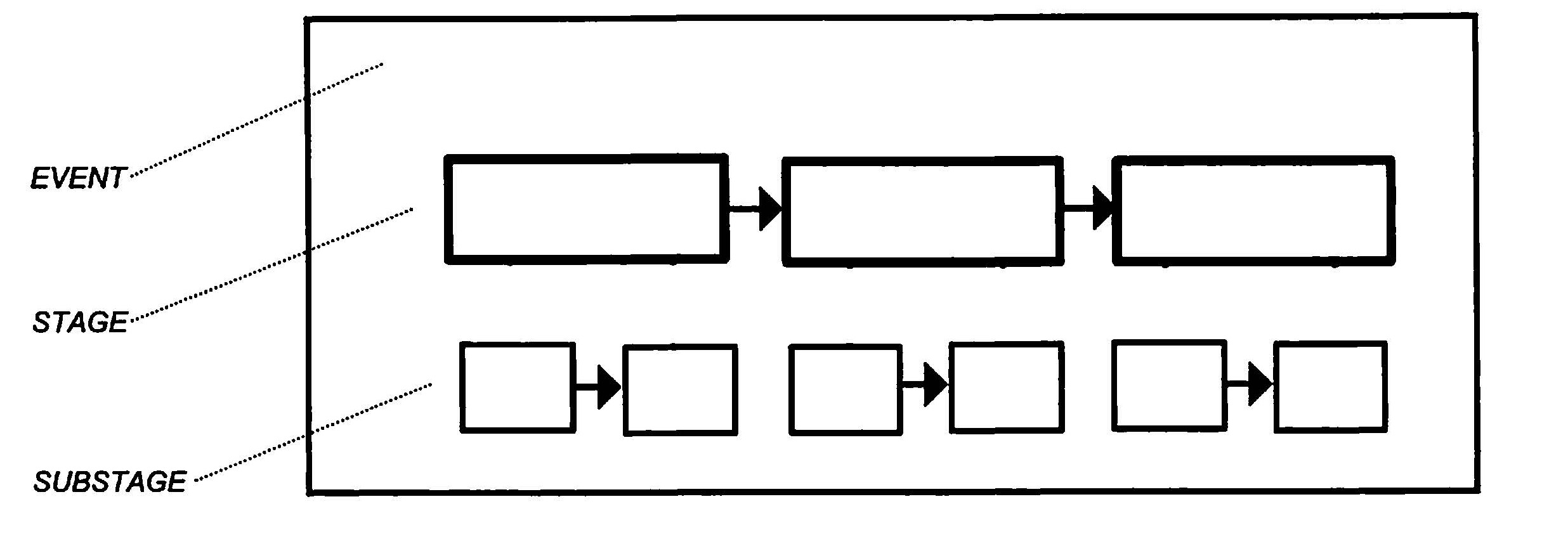 The Flow Map is used for sequencing and ordering information. In the outside rectangle write the name for the event, or sequence. In the larger rectangles-flowing from left to right-write in the major stages of the event. In the smaller rectangles below, write in the substages of each major stage.