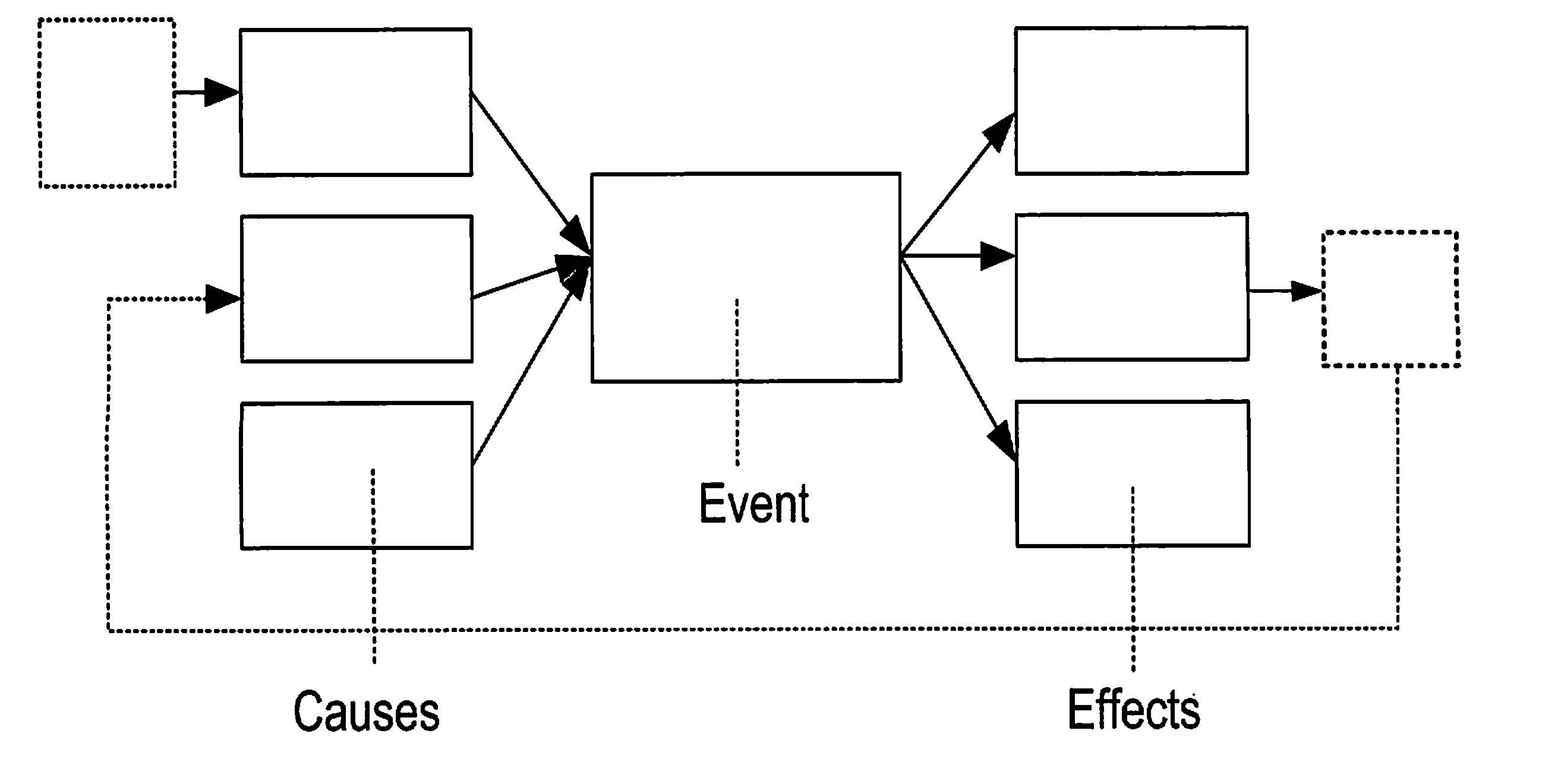 The Multi-Flow Map is used for showing and analyzing cause and effect relationships. In the center rectangle, write in an important event that occurred. On the left side of the event, write in the causes of the event, and on the right side, write in the effects of the event. As you identify more causes and effects, add them to the Map. If you are studying a system, you will find that there are effects in the system that, in turn, influence initial causes. This circular cause and effect relationship is called a feedback loop.